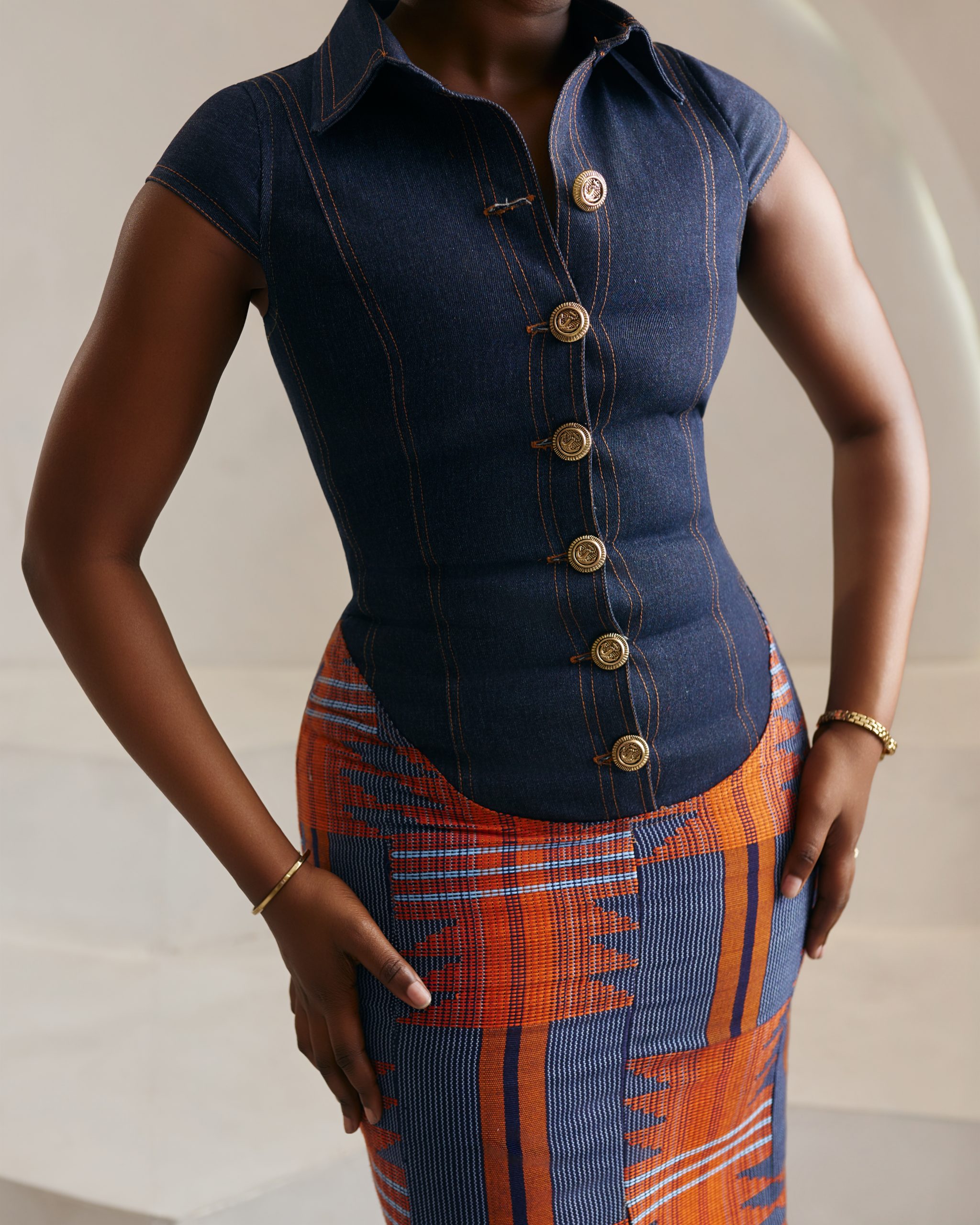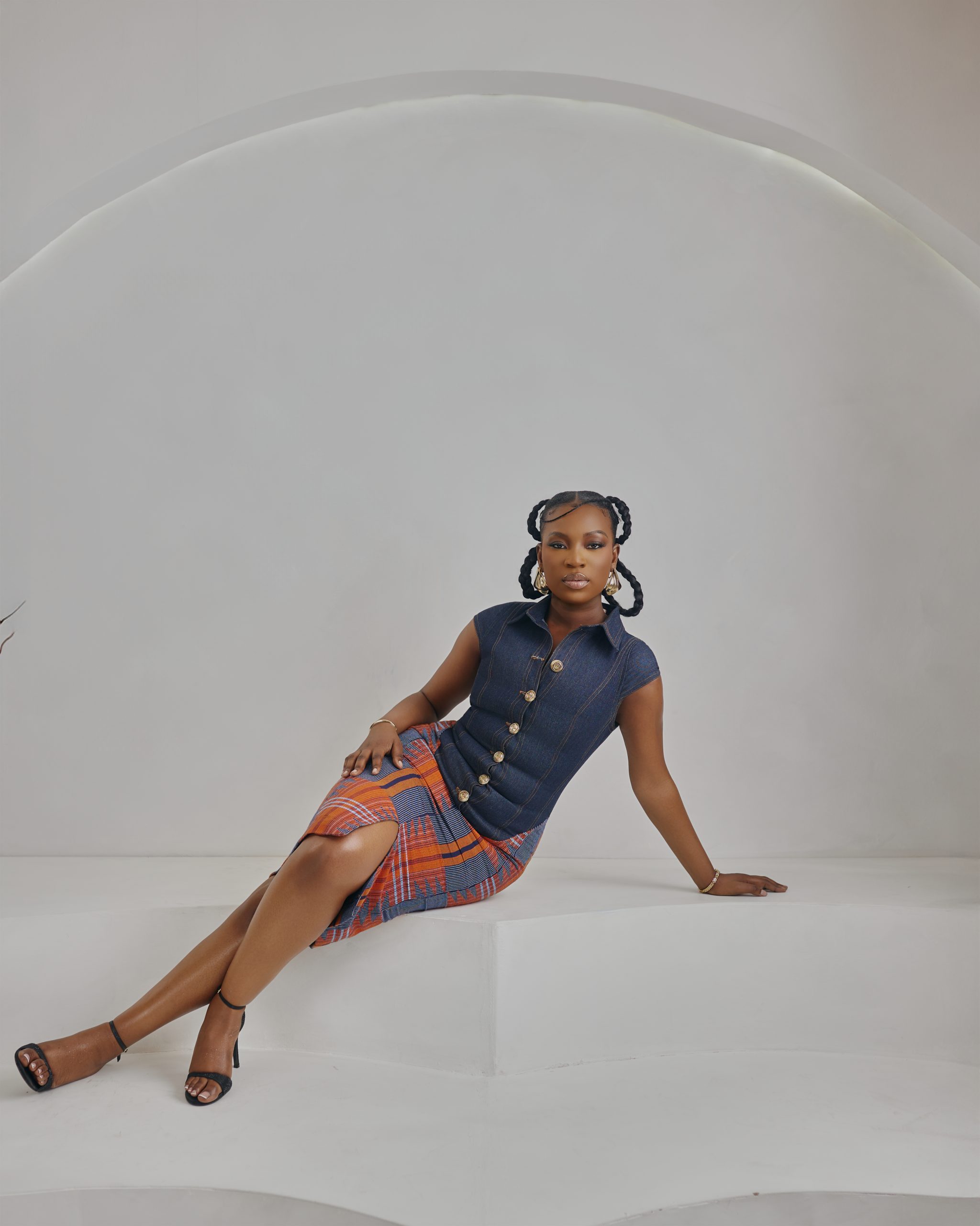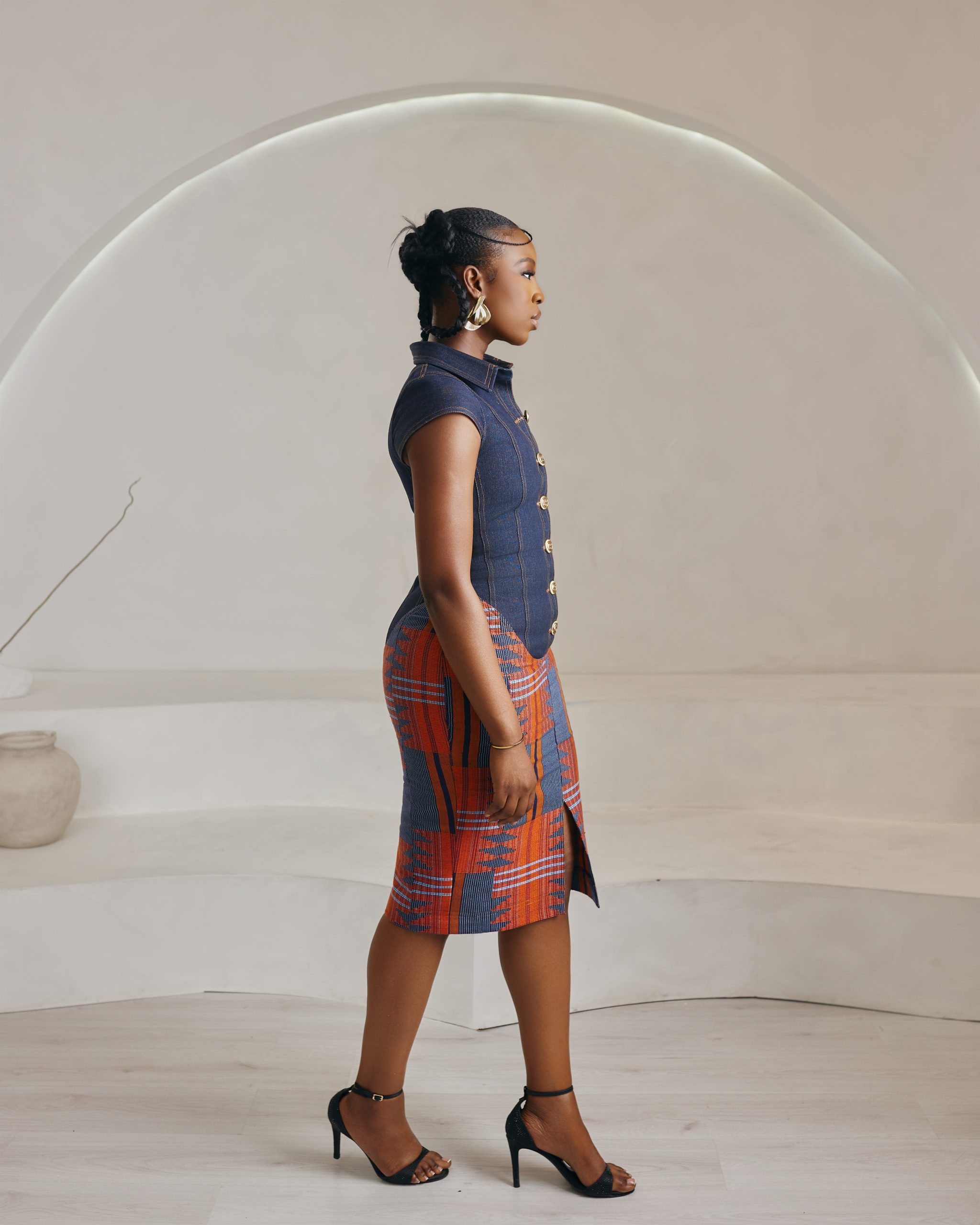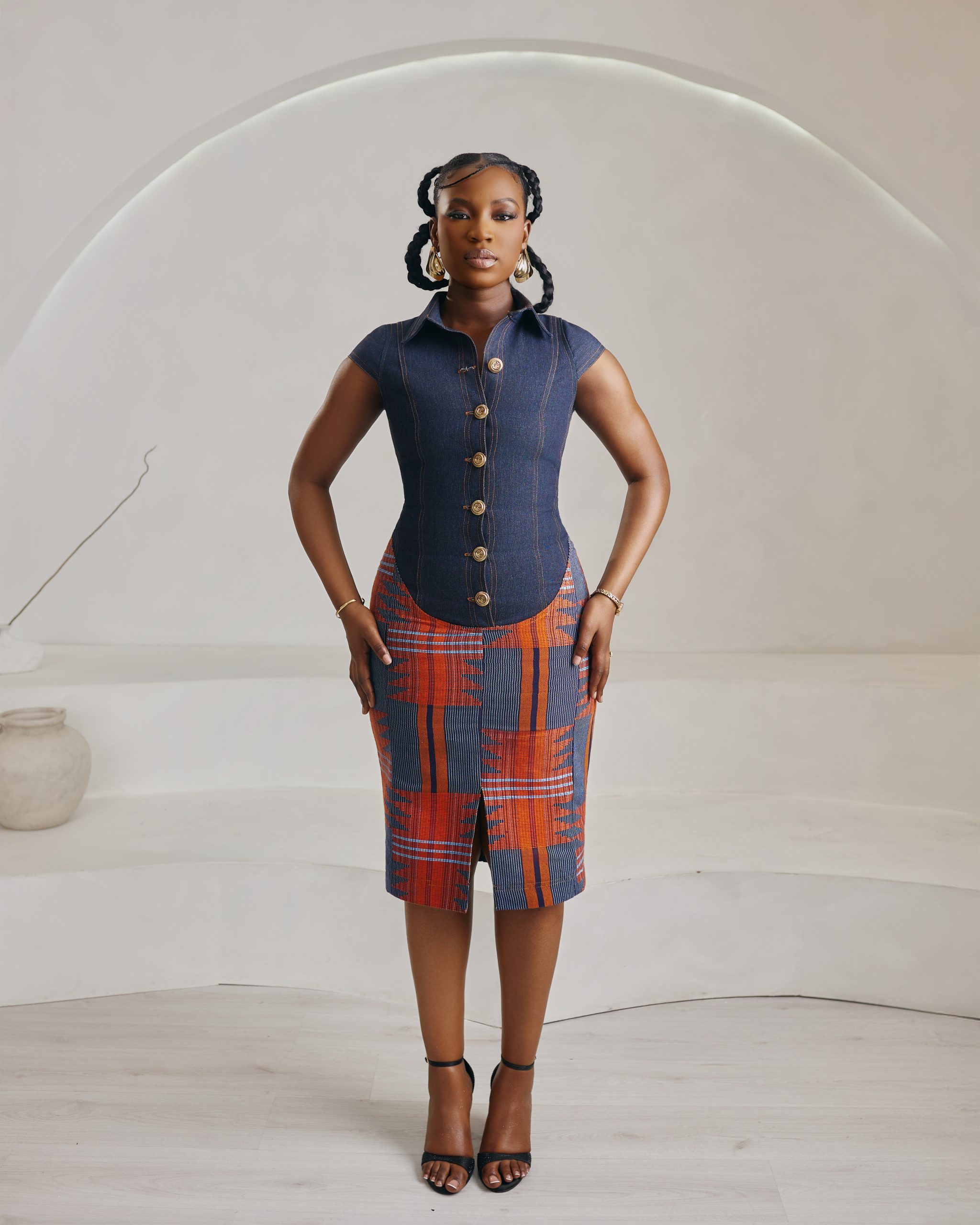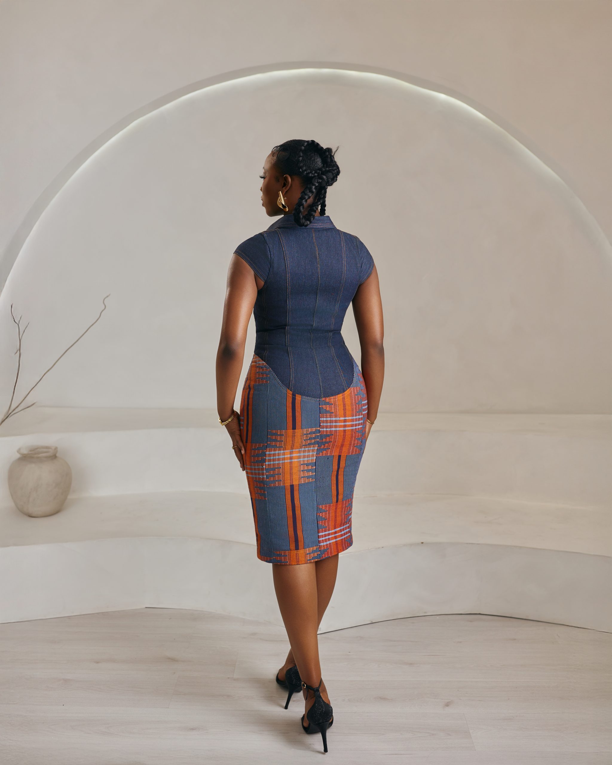 A timeless piece. The Ìrẹ́lẹ̀ dress is a tailored vision of quiet elegance. Featuring a collared neckline, button-down detailing, and a fitted pencil skirt silhouette, it fuses the resilience of denim with the richness of aso oke. Designed to accentuate structure while remaining feminine, Ìrẹ́lẹ̀ is versatile enough for boardroom presence or evening sophistication. Style with sleek accessories for a polished, modern look. Model is wearing Large (L).