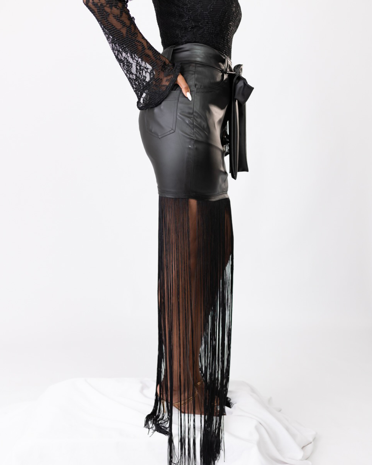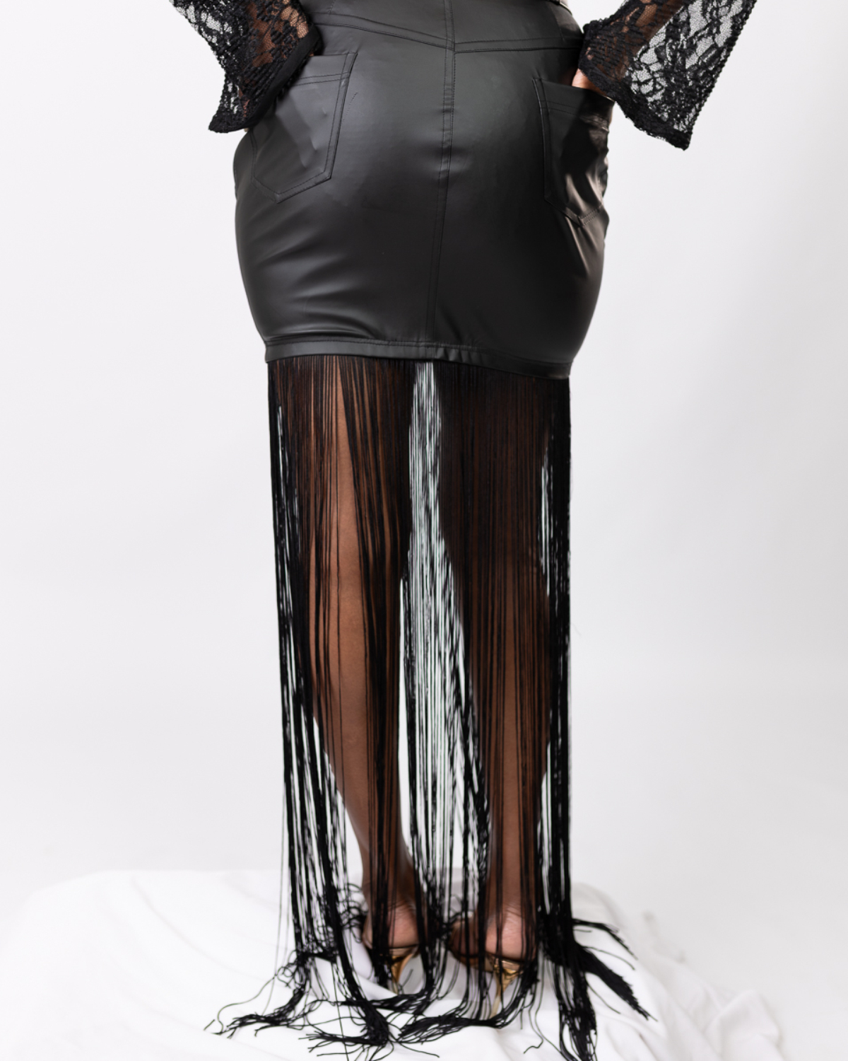 The Alara mini leather skirt is a chic blend of sleek leather and striking, extended tassels. True to its name, this skirt brings brightness and joy not only to the eye but also to the wearer, celebrating the feminine form with elegance and confidence